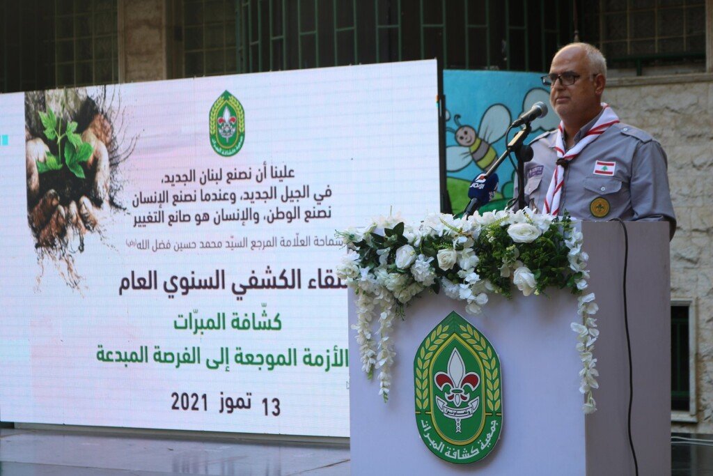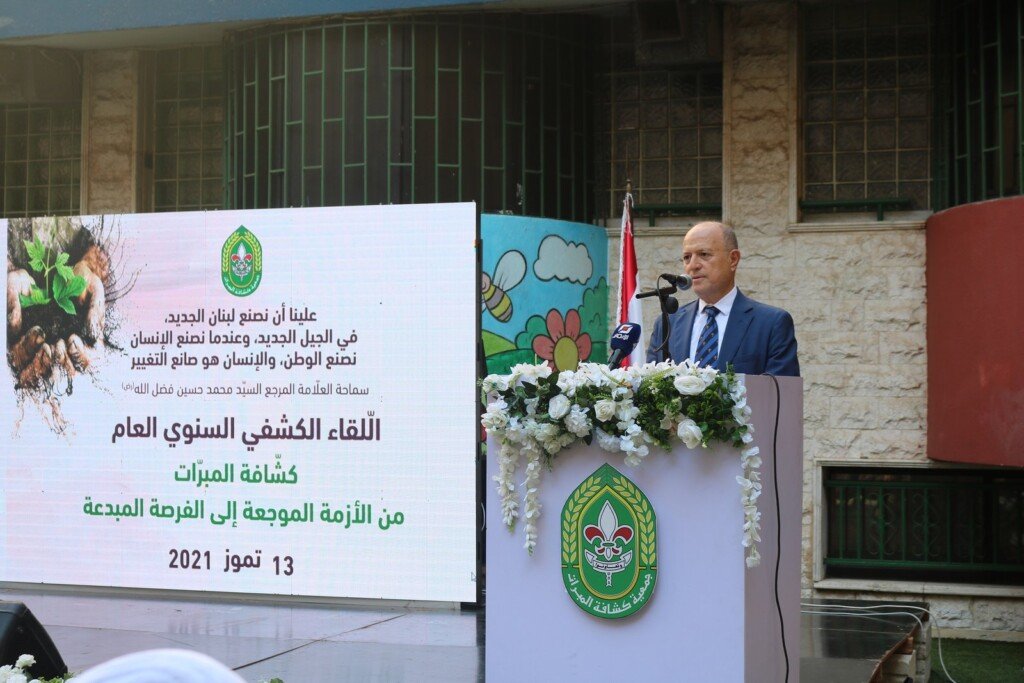 بعد ذلك، ألقى رئيس جمعية كشافة المبرّات الدكتور محمد باقر فضل الله كلمة تحدث فيها عن “تداعيات الأزمات المعيشية والوبائية التي تخيّم بظلالها على آفاقنا غيوماً ملبّدة بالشؤم وتنذر بالويل والثبور وعظائم الأمور”.